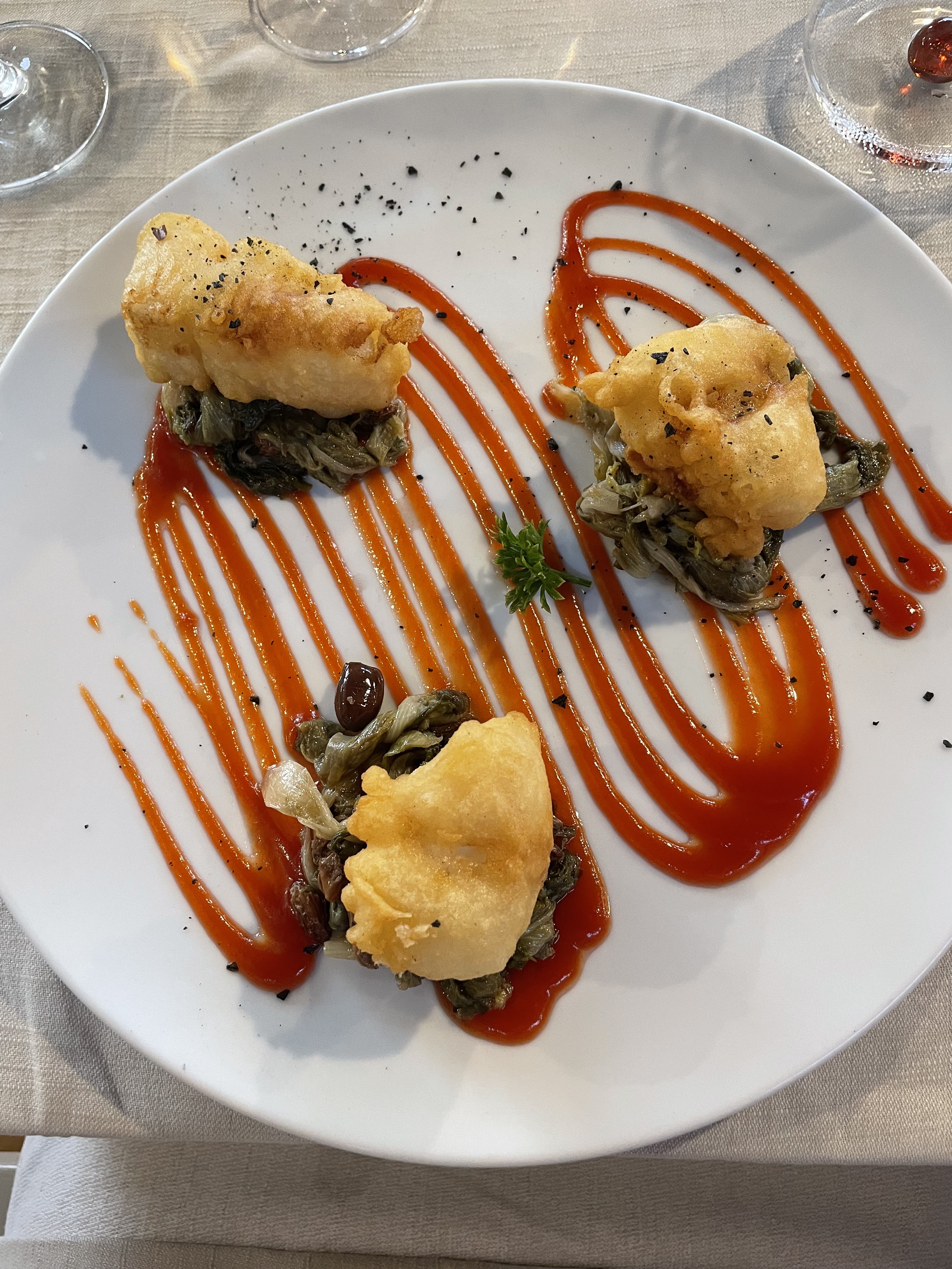 “I didn’t think I could eat any more, but Gabriele laughed and told me to find my second stomach. Somehow the suggestion helped, and when a big bowl of prawns was set before me, I managed to slowly peel the shells and eat. Cooked in tomato broth with oregano and served five to a bowl, the prawns were as red as lobsters and seemed half as big. Getting off the shells was a messy business, but I was glad to exert the effort, which gave me time to digest and maybe even burn a few calories. Thankfully, my second stomach had opened”